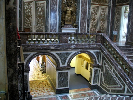 On Saturday we ventured out around town despite the showery weather and visited Oldway mansion which was built in the late 1800's by Isaac Emmeritt Singer, the man who gave the world the sewing machine. He didn't invented it, merely improved a machine built by somebody else but failed to patent it soon enough. When the mansion was built it cost £100,000 and has been added on to over the years by Isaac's son Paris. Inside the main entrance is a beautiful ornate sweeping marble staircase with a beautiful handpainted ceiling. Of a standard matching a certain other ceiling in Rome.