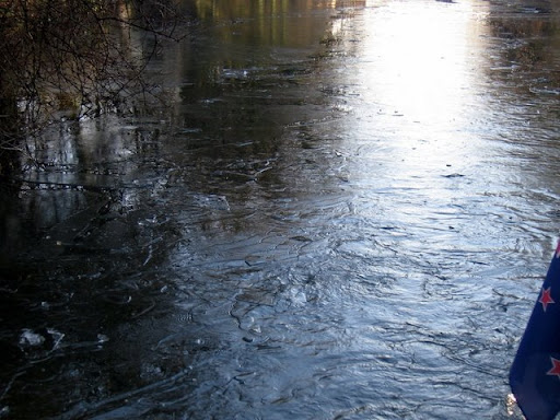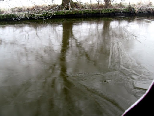 To start with I had to go around the boat with the pole hook and smash the ice before we could move at all. After 3 goes of backwards and forwards we finally started to make headway up to the water point. The ice was about 10 - 15mm thick, the thickest we have struck, excuse the pun. At the water point somebody had left the tap dripping so it wouldn't freeze up,lucky for us.
