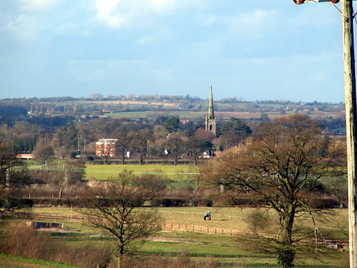It didn't take long to reach our present mooring so we thought we would wander up into the township of Hartshill which is referred to as a suburbanised village. Our initial attempt was abandoned as being too dangerous due to the road from bridge 32 up the hill being too narrow, it was barely wide enough for 2 vehicle's let alone 2 pedestrians with no footpath to follow. We decided to head back down to the towpath along to bridge 33 where we found the proverbial cross country footpath or bridlepath which took us into town. Here we spoke to a local guy who was out walking his dog who pointed us in the right direction. At the highest point of the town the outlook out over Anker Valley was absolutely marvellous.